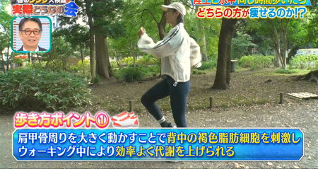 肩甲骨周りを大きく動かすことで背中の褐色脂肪細胞を刺激してウォーキング中に効率よく代謝アップ。