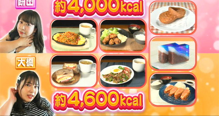 2日間で水中餅田は4000kcal、陸上大橋は4600kcalの食事を摂り、お互いにメニューは全く同じで食事量だけ調整という違いのみ。