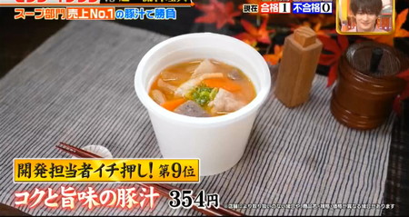 小さい容器だとにんじんや大根のイヤな部分が目立ちやすくなる所を、それが全く感じられず、それぞれの具材が生きる形で美味しくなるべくして美味しくなった豚汁で「今すぐ買いに行って食べたい」とコメントが出るほど絶賛。