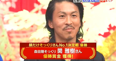 全ての出場者が出そろった時点でチャンピオンの座にいたのは森田剛のそっくりさんで登場した関さんが優勝という結果に。ものまね紅白2025秋 顔だけそっくりさん優勝者は森田剛