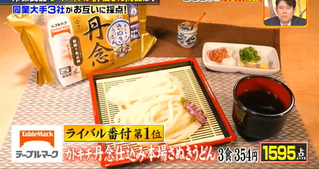 門外不出の新製法を採用する事で職人技の縦横に生地を伸ばす工程を経る事で3位のカトキチさぬきうどんのさらに上を行くレベルに仕上がっているとライバルたちも驚き。さらには職人の手作業を再現するために麺の太さもについてもあえて均一にせず少しバラつきを持たせる事で食感に変化が生まれて飽きないという指摘も。