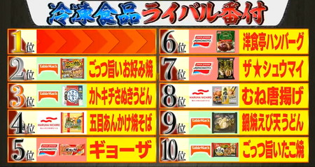以上「ジョブチューン」から冷凍食品ライバル番付第1弾のランキング果一覧でした。