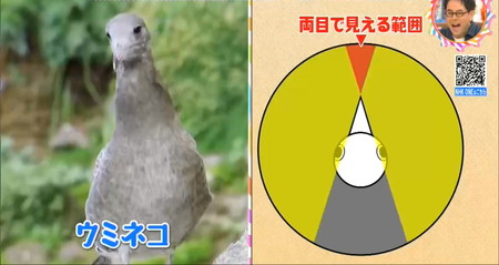 ハト、インコ、ウミネコなどの多くの鳥は顔の左右に目が付いていて非常に広い視野を持っていてほぼ後ろまで見えている状態。