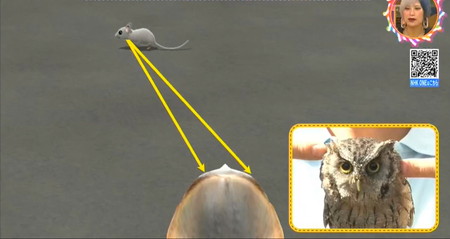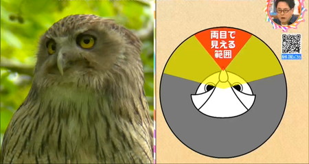 これはフクロウが肉食でネズミ・ウサギ・ヘビ・昆虫などの獲物を狩る動物だからで、目が正面に2つ付いていると2つの目で一つのターゲットを捉える事が出来るのでより正確な距離が分かるというのが理由。