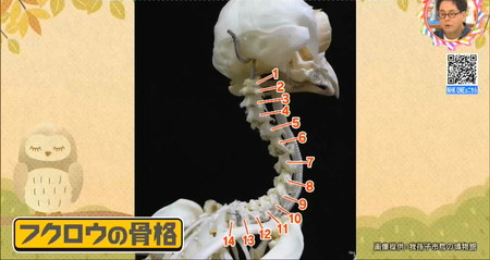人や首の長いキリンなどを含むほとんどの哺乳類の首の骨の数は7個になっていますが、フクロウではその数が倍の14個になっていて、これがフクロウの首クルクルの秘密の答え。