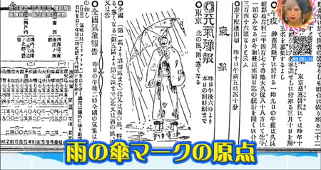 ここから4年後の1888年には24時間先まで予報するように進化していきますが、ここで多くの新聞に天気予報が掲載されるようになりましたが、そんな中で時事新報という新聞が傘を差して雨に降られる人物のイラストを載せるという試みを初めて取り入れて、これがのちの雨の傘マークの原点に。天気予報で雨が傘マークなのはなぜ?日本と海外で違う理由は?チコちゃん