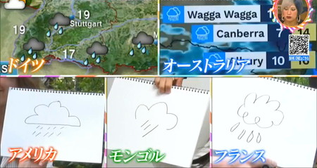 日本以外の海外の天気予報では雲から雨粒や雨のラインが落ちているイメージが雨のマークとして広く認知されており、その一方で日本では傘マークを入れたデザインとなっており、これは世界的に見てもかなり珍しいパターン。天気予報で雨が傘マークなのは日本だけ?