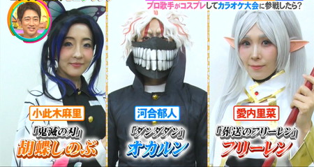 その他にも小此木麻里は胡蝶しのぶ (鬼滅の刃)のコスプレ姿、河合郁人はオカルン(ダンダダン)、愛内里菜はフリーレン(永遠のフリーレン)も。モニタリングコスプレカラオケ正体 河合郁人、愛内里菜、小此木麻里
