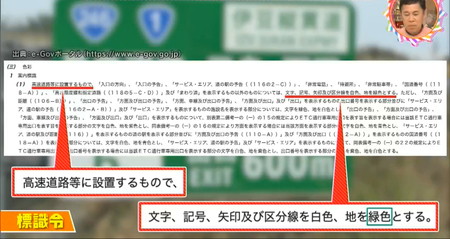 そもそも道路の案内標識が一般道では「青バックに白文字」で高速道路では「緑バックに白文字」になっているのは法令で定められているからで、通称・標識令と呼ばれる法令に明記されているのでこのルールは絶対。