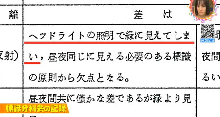 それでも話し合いでは結論が出ないという事で両者の性能検証が行われる事になりますが、そこで文字の見やすさという点では「昼も夜も僅かな差で青の方が緑より見えやすい」という結果に。ただし環境との調和の面では「緑の方が環境との調和が良くて美しい」という意見が多数。