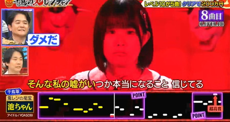 ちなみに鬼ハード挑戦権を持つ出演者で意識する存在を聞かれると、初登場でいきなり鬼レンチャンを達成したノイミーのももきゅんこと櫻井ももの名前を挙げる池ちゃん。