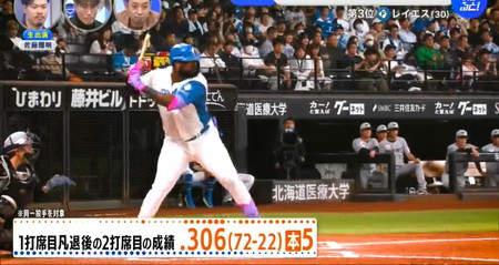 1打席目で凡退した後に2打席目の成績は今季72-22で.306(本塁打5)というデータがあるように同じ手は2度食らわないクレバーなバッターというパワーだけではない好打者の一面も。