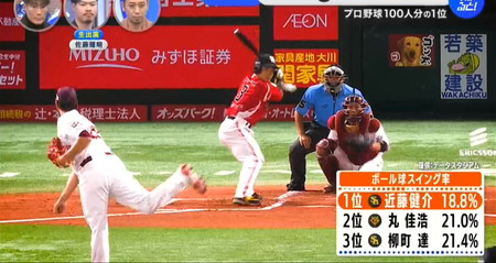 ボール球のスイング率は18.8%で12球団トップの数値で2位の丸佳浩21.0%と比べても頭一つ抜けているデータ。つまり日本球界で最もボール球を振らない打者が近藤健介。