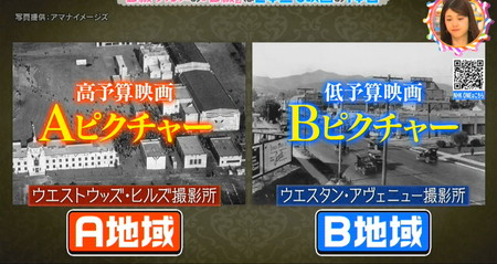 となると2つの撮影所が存在するわけで、これらを区別する意味で新しい撮影所をA地域、古い撮影所をB地域と呼ぶようになっていき、A地域で作られた高予算映画をAピクチャー、B地域で作られた低予算映画をBピクチャーと呼ぶように。