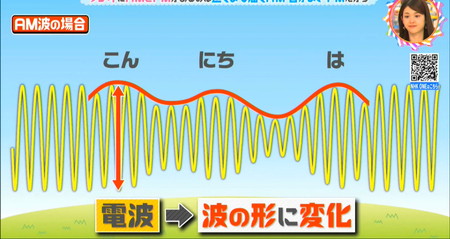 電波とは細かい波の集合体の事で、ここに声の電気信号を重ねると電波の縦幅が電気信号と同じ波の形に変化し、AMラジオの音の変換