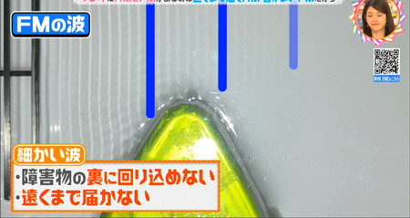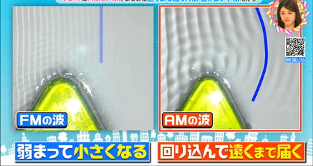 これがAM波の基本的な仕組みで、電波を遠くまで届けられるのが特徴の一つで、波の幅が大きいAMは高い建物や山などの障害物があっても電波がぶつからずに回り込む事が出来るので遠くまで届くのに対して、FM波は細かい波が障害物に当たると回り込めないので遠くまでは届かないというデメリット。