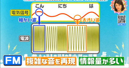 これに対してFMの場合は音の強弱に合わせて波の密度を変化させるという変換方法を取っていて、音の強い所は間隔が詰まった細かい波に、弱い所は大きな波に変えるので複雑な音を簡単に再現でき、波の数も多いので送れる情報も多いので高音質でクリア。FMラジオの音の変換