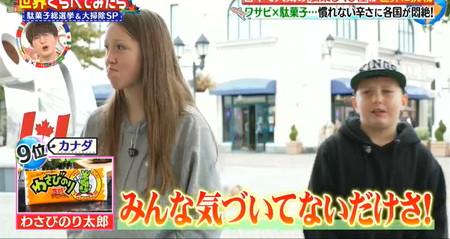 カナダではカナダ産のわさびも栽培&販売されるほどにわさびが浸透しつつあるそうで、もっとわさびのツーンとした辛味が欲しいという真逆のリアクションをする人も現れる中、それでもやっぱりわさびの辛味は苦手と全体としては不評。ただし、中には噛んでいるうちに美味しい味が出て来る「みんな気付いていないだけさ」と通っぽい事を語る少年も登場。世界くらべてみたら わさびのり太郎を評価するカナダの少年