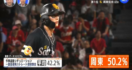 盗塁を警戒するあまりに周東が一塁にいる時のストレート投球割合は50.2%で12球団平均の42.2%を上回る数値。5割を超えるのはパ・リーグでは周東ただ一人という特別な存在。すぽると100人分の1位 周東一塁の時のストレート割合は5割越え
