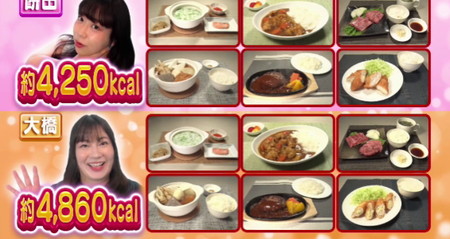 2日間でボード餅田は4250kcal、ボール大橋は486kcalの食事を摂り、お互いにメニューは全く同じで食事量だけ調整という違いのみ。