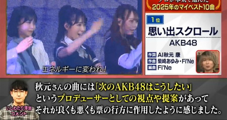 「(AIの過去曲の学習にのおかげで)よりAKB48らしい曲を作った印象で、それがファンにとっては安心感のようなものがあって多くの票が集まったように感じました。(秋元康本人の作詞曲は)次のAKB48はこうしたいというプロデューサー視点や提案があて、それが良くも悪くも票の行方に作用したように感じました。」