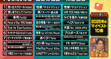 26年1月11日、18日放送の「EIGHT-JAM」では関ジャムから続くランキングのプロが選ぶ2025年マイベスト10という事でアーティスト&紹介曲を一覧でまとめてご紹介。一番のサプライズ選出曲は一体?