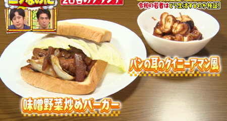 パンの端っこ2枚にバター代わりにごま油を垂らして広げ、トースターでカリッと焼く。その間に白菜や油揚げにインスタント味噌汁を絡めてフライパンで炒める。レタス代わりに生の白菜をサンドしたら完成。
