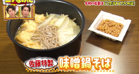 鍋に野菜・油揚げ・蕎麦を入れ、料理酒・みりん・インスタント味噌汁を溶かして完成。たんぱく質のために納豆も添えて晩ご飯完成。