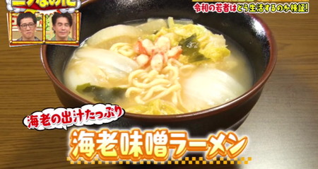 焼きそば麺をラーメンの麺代わりにして、野菜・インスタント味噌汁で味付け。エビで海鮮系の味をプラス。恐らくみりんや料理酒も?