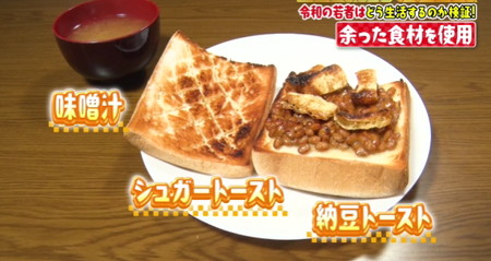 朝食は砂糖を溶かしたトーストと納豆&炒めた油揚げが乗ったトーストとインスタント味噌汁のセット。