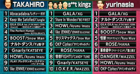 s**t kingzは3位に、yurinasiaは9位に選び、選者のプロ3組全員が同曲をランクイン。