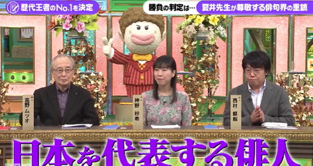 日本を代表する俳人3名(高野ムツオ、神野沙希、西村麒麟)に加え、1回戦、準決勝で脱落した出場者も順次加わって全員で勝敗を判定。プレバト俳句トーナメント2026 審査員の高野先生、神野先生、西村先生