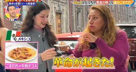 メキシコでは炒めたピーナッツにトマトや玉ねぎなどの野菜やニンニクを入れて作るソースのカカワタードに似ているという感想でメキシコの味がするとごまだれを絶賛。さらに辛味の無いソースはタコスには合うはずがないと言い張っていたメキシコ人でも実際にごまだれを付けて食べてみるとみんな意外な相性の良さに革命的リアクション。世界くらべてみたら ごまだれとタコスで革命的な味とメキシコ人の反応