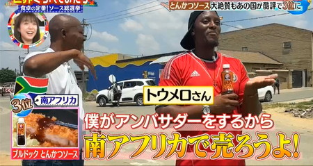 南アフリカでは「何だこのソースは…」と衝撃的な美味しさだったようで、かつてイギリス貿易の中継点としてインド文化との関わりが深かった南アフリカというお国柄を反映し、フルーツに玉ねぎ、砂糖、スパイスなどを加えて煮詰めるインド定番の調味料チャツネにBBQソースを合わせたような味が天才的と大絶賛。世界くらべてみたら とんかつソースが南アフリカで大絶賛