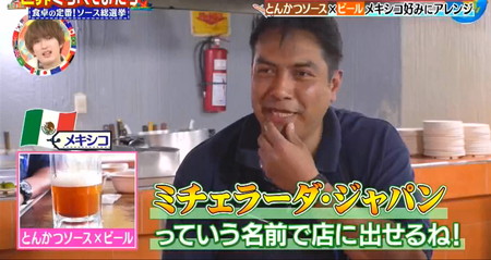 メキシコではスパイシーなので揚げ物に合いそうという感想で、薄切りの豚肉にパン粉を付けて揚げるメキシコ版とんかつとも言えるミラネーサに付けたら美味しそうというコメントも飛び出してメキシコ人も日本人同様の味覚を持っていることが判明。ちなみに現地のタコス店ではビールジョッキにとんかつソースを入れてライムを搾ってビールを割るという衝撃のカクテルをその場で考案。現地のミチェラーダ(トマトソース、塩、ライム、お好みでタバスコなどで割るビアカクテル)をイメージしたそうでミチェラーダ・ジャパンが爆誕。世界くらべてみたら とんかつソースとビールのカクテル