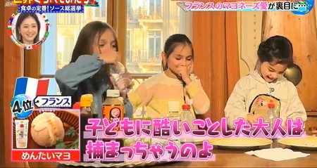 フランスではマヨネーズに含まれる粒々がタラマソース(魚卵、レモン、オリーブオイル、パン粉を混ぜたソース)に似ているという第一印象だったものの、マヨネーズの食感に魚卵のプチプチ食感が絶望的に合わないと意外な大不評。自家製マヨを作るほどにこだわりが強いフランスでは魚卵入りは邪道と受け入れられなかった様子。ちなみに子どもたちは辛すぎてパニック状態で逮捕案件まで飛び出す始末。世界くらべてみたら めんたいマヨを初めて食べたフランスの子どもたちの反応