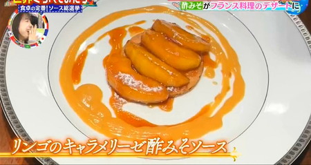 フランスでは味噌の発酵臭や味噌糀が加わった独特の甘さがどうしても違和感として口に残って不評。一方でミシュラン一つ星シェフはスイーツ向きという評価で酢みそスイーツレシピ「リンゴのキャラメリーゼ酢みそソース」を考案。世界くらべてみたら 酢みそのりんごスイーツ