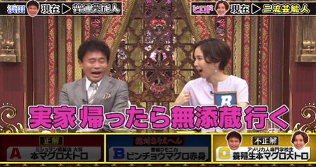 Aを絶対ありえへんと予想していたヒロドアナはあと一歩で映す価値無しになる所でセーフ。実家に帰ったら無添蔵にいつも行くのでBが無添蔵と赤っ恥発言も。格付けチェック2026春 無添蔵によく行くヒロドアナ