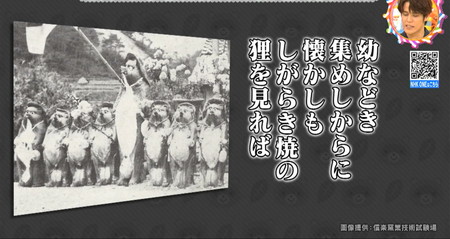 沿道に並んだたぬきの置物たちが日の丸を掲げて昭和天皇をお出迎えしたこの試みは昭和天皇が行く先々で行われ、実は幼少期にたぬきの置物をたくさん持っていて元々たぬきに親しみがあったという昭和天皇はこの歓迎を大変喜んだそうで、この光景を見た昭和天皇は「幼などき 集めしからに 懐かしも しがらき焼の 狸を見れば」と幼い頃から集めていたたぬきの置物を見ると懐かしい気持ちになるという歌を詠んで記念に。
