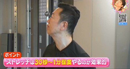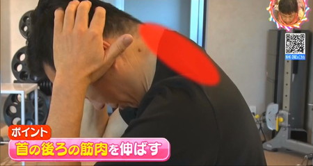 首の前後を伸ばすのを1セットにして繰り返し行うとスマホを長時間観すぎて硬くなった筋肉を柔らかくする効果があると中野先生。