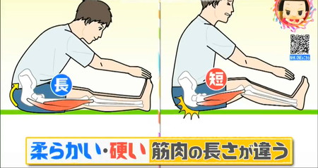 例えば座って足を伸ばしてつま先に手を触れようとする長座体前屈をする時を考えてみると、体が硬い人というのは太ももの裏にある筋肉が「短い」せいで筋肉に骨盤が引っ張られて結果的に膝が浮き上がってしまって前屈出来ないという事に。