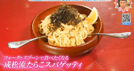 そこで1秒でも早くたらこスパゲッティを提供したいと考えた成松孝安は客に提供する皿でソースを作る事で少しでも時短。具体的には食感の違う2種類のたらこを皿に入れてバター、昆布粉、塩少々を加えて材料全体をスプーンで和えて茹で上がったスパゲッティをイン。そこからスプーンとフォークを使って麺とたらこソースを和えて刻み海苔、レモンを添えて完成という手順。