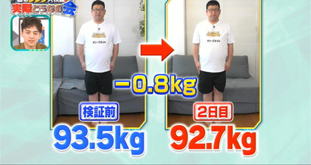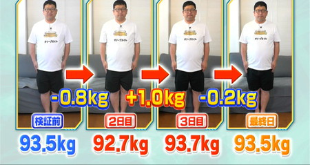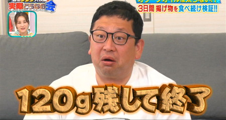 美しきリバウンドに直面するも「6食食べた人間はこの世に僕しかいないから7、8、9と食べた時にどうなるか最後まで追求したい!」と口にしつつ最終日はお腹の具合と相談した結果一食につき500gにして検証継続。