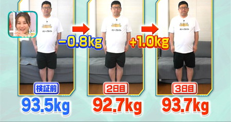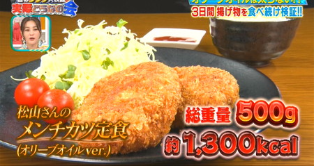 ちなみにオリーブオイルの低温じっくり揚げに合わせて中のお肉は豚ひき肉に変更してキャベツを追加するというアレンジレシピ。そんな松山さんメンチカツはこれまでの検証で3度登場し、その全てで翌日体重増加という実は鬼門メニュー。